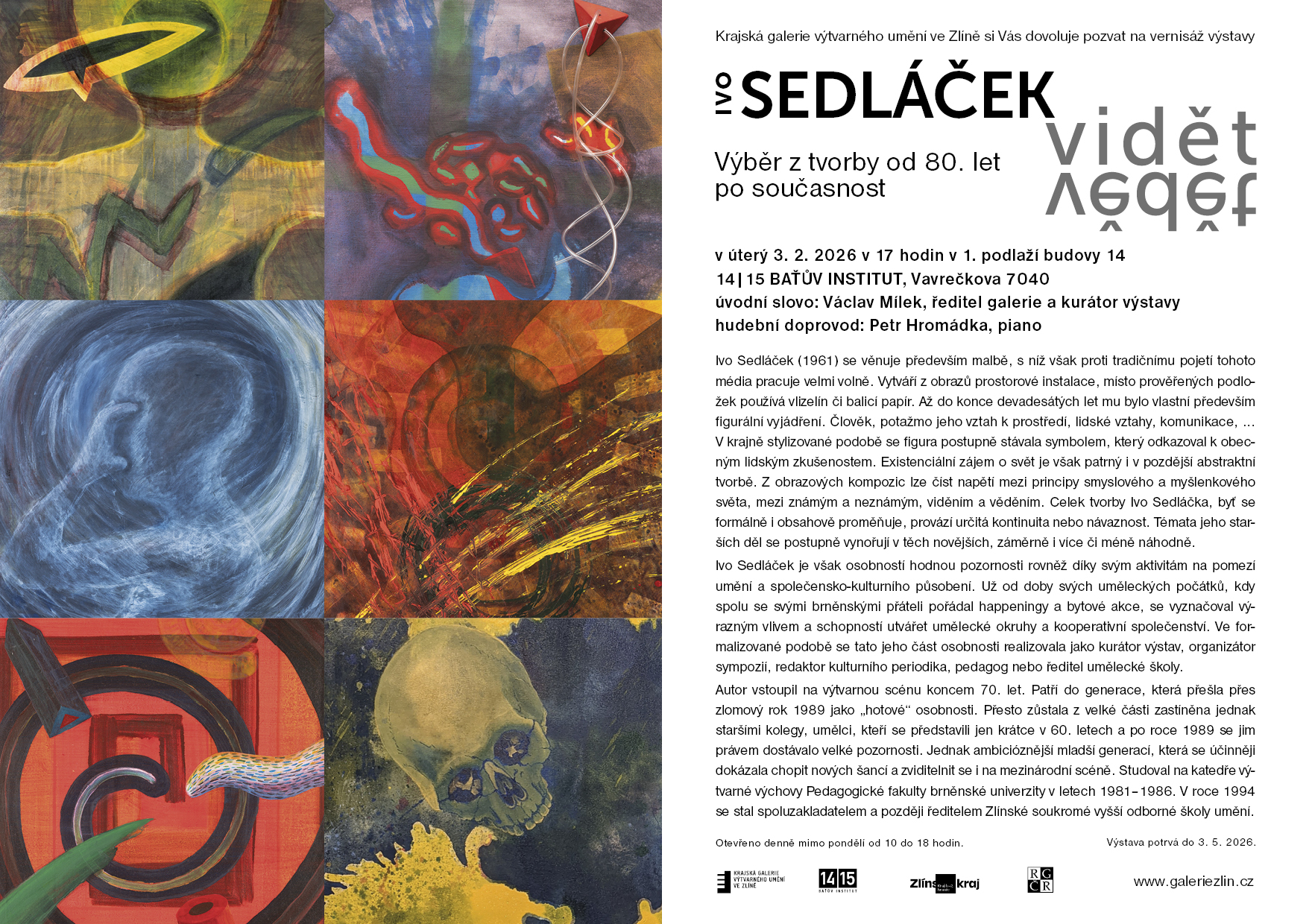 Srdečně zveme vás i vaše známé na slavnostní zahájení výstavy Ivo Sedláček - Vidět - vědět v úterý 3. února 2026 v 17 hodin.